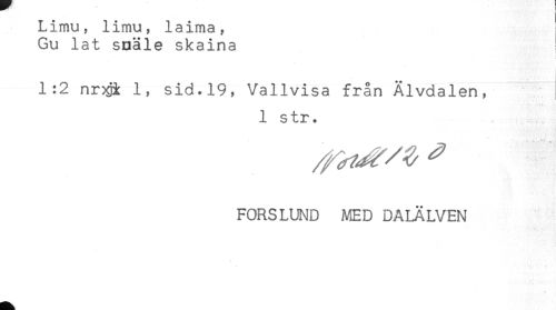 //// Limu, limu, laima, //// Gu lat snäle skaina //// 1:2 nr# 1, sid.19, Vallvisa från Älvdalen, //// 1 str. //// FORSLUND MED DALÄLVEN ////