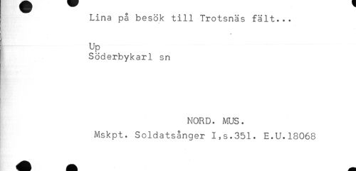 //// Lina på besök till Trotsnäs fält... //// Up //// Söderbykarl sn //// < //// NORD. ms. //// Mskpt. Soldatsånger I,s.351. E.U.18068 ////