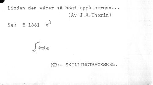 //// Linden den växer så högt uppå bergen... //// (Av J.A.Thorin) //// Se: E 1881 e^ //// Jfl^) //// KB:s SKILLINGTRYCKSREG. //// <* ////