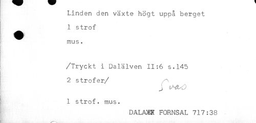 //// Linden den växte högt uppå berget //// 1 strof //// mus. //// i //// /Tryckt i Dalälven 11:6 s.145 //// . //// 2 strofer //// /) //// < //// 1 strof. mus. //// DALAXK FORNSAL 717:38 ////