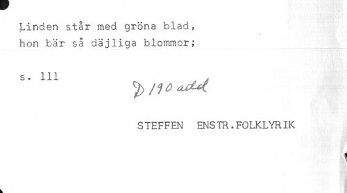 //// Linden står med gröna blad, //// hon bär så däjliga blommor; //// s. 111 . , //// STEFFEN ENSTR.FOLKLYRIK ////