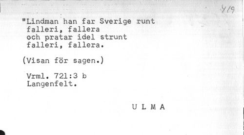 //// "Lindman han far Sverige runt //// falleri, fallera //// och pratar idel strunt //// falleris fallera. //// (Visan för sägen.) //// ! //// Vrml. 721:3 b //// Langenfelt. //// . t //// U L M A //// - //// : ////