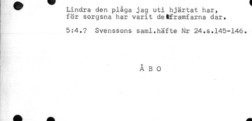 //// ^ Lindra den plåga jag uti hjärtat har, //// för sorgsna har varit detframfarna dar. //// 5:4.? Svenssons saml.häfte Nr 24.s.145-146. //// o //// A B O //// t //// \ ////