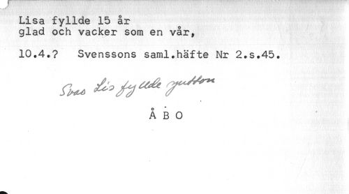 //// Lisa fyllde 15 år //// glad och vacker som en vår, //// 10.4.? Svenssons saml.häfte Nr 2.S.45. //// ÅBO ////