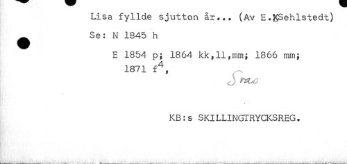 //// Lisa fyllde sjutton år... (Av E.RSehlstedt) //// ^ Se: N 1845 h //// E 1854 p; 1864 kk,ll,mm; 1866 mm; //// 1871 f\ //// KB:s SKILLINGTRYCKSREG. ////