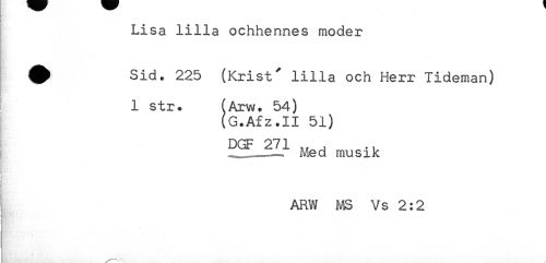 //// Lisa lilla ochhermes moder //// # Sid. 225 (Krist' lilla och Herr lideman) //// ! 1 str. (Arw* 54) //// (G.Afz.II 51) //// DGF 271 ,, , //// .... Med musik //// t //// É //// i //// ! //// ! //// ! //// t //// ARW MS Vs 2:2 //// n //// ^ //// /-- ////