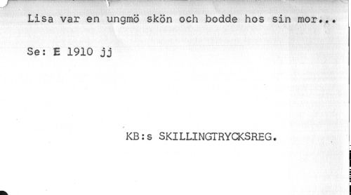 //// Lisa var en ungmö skön och bodde hos sin mor... //// Se: E 1910 jj //// KB:s SKILLINGTRYCKSREG. //// t //// a //// H) //// s //// H ////