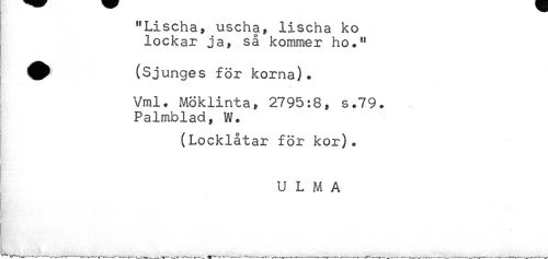 //// "Lischa, uscha, lischa ko //// lockar ja, så kommer ho." //// ^^ (Sjunges för korna). //// Vml. Möklinta, 2795:8, s.79. //// Palmblad, W. //// (Locklåtar för kor). //// ; //// U L M A ////