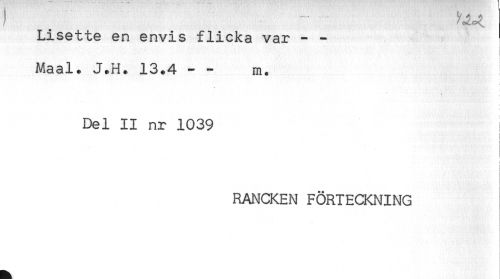 //// ? ^ -..... //// Lisette en envis flicka var - - //// Maal. J.H. 13.4 - - m. ! //// t //// Del II nr 1039 //// i //// < //// < //// < //// < //// RANCKEN FÖRTECKNING ////