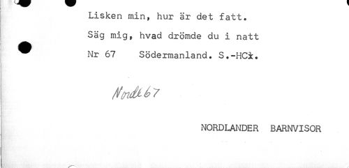 //// Lisken min, hur är det fatt. //// - //// < //// Säg mig, hvad drömde du i natt //// Nr 67 Södermanland. S.-HCi. //// !-' //// j //// NORDLANDER BARNVISOR ////