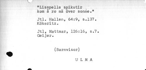 //// "Lisspelle spikutir //// kom å ro mä över sonne." //// Jtl. Hallen, 64:9, s.137. //// Kökeritz. //// Jtl, Mattmary 126:16, s*7. //// Geijer. //// ^^ (Barnvisor) //// U L M A ////