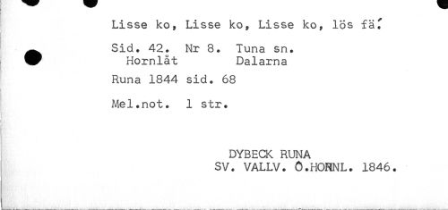 //// Lisse ko, Lisse ko, Lisse ko, lös fäf //// ^^ Sid. 42. Nr 8. Tuna sn. //// ^ Hornlåt Dalarna //// Runa 1844 sid. 68 //// < //// Mel.not. 1 str. //// i //// i //// ' //// DYBECK RUNA //// SV. VALLV. 0.HONNL. 1846. ////
