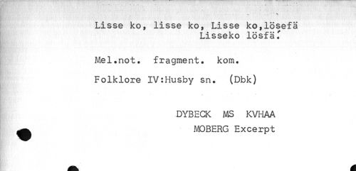 //// Lisse ko, lisse ko, Lisse ko,lösefä //// Lisseko lösfä^ //// r' ' //// Mel.not. fragment, kom. //// Folklore IV:Husby sn. (Dbk) //// L //// DYBECK MS KVHAA //// ^ MOBERG Excerpt ////