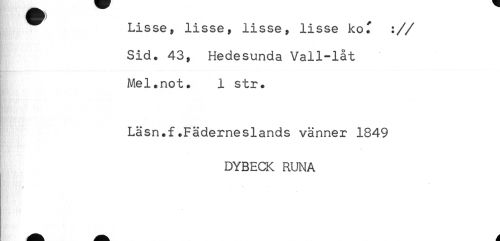 //// Lisse, lisse, lisse, lisse kof : //// //Sid. 43, Hedesunda Vall-låt //// Mel.not. 1 str. //// Läsn.f.Fäderneslands vänner 1849 //// DYBECK RUNA ////