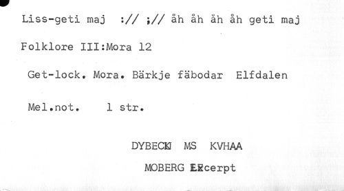 //// Liss-geti maj :// ;// åh åh åh åh geti maj //// Folklore III:Mora 12 //// Get-lock. Mora. Bärkje fäbodar Elfdalen //// Mel.not. 1 str. //// DYBECK MS KVHAA //// MOBERG ERcerpt ////
