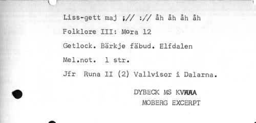 //// Liss-gett maj ;// :// åh åh åh åh //// Folklore III: Mora 12 //// Getlock. Bärkje fabud. Elfdalen //// Mel.not. 1 str. //// Jfr Runa II (2) Vallvisor i Dalarna. //// ^ DYBECK MS KVHHA //// MOBERG EXCERPT ////