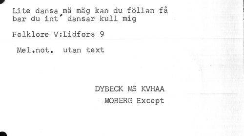 //// Lite dansa mä mäg kan du föllan fa ! //// bar du int' dansar kull mig I //// ! //// Folklore V:Lidfors 9 //// Mel.not. utan text //// DYBECK MS KVHAA //// MOBERG Except ////
