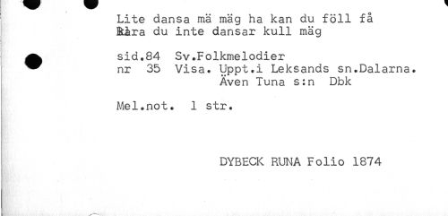 //// < Q //// Lite dansa mä mäg ha kan du föll fa //// Råra du inte dansar kull mäg //// ^ sid.84 Sv.Folkmelodier //// ^ nr 35 Visa. Uppt.i Leksands sn.Dalarna. //// Även Tuna s:n Dbk //// Mel.not. 1 str. //// DYBECK RUNA Folio 1874 ////