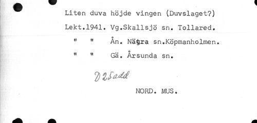 //// Liten duva höjde vingen (Duvslaget?) //// Lekt.1941. Vg.Skallsjö sn. Tollared. //// o //// ' " An. Nä$ra sn.Köpmanholmen. //// " " Gä. Årsunda sn. //// NORD. MUS. ////
