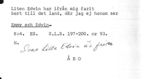 //// Liten Edvin har ifrån mig farit //// bort till det land, där jag ej honom ser //// Emmy och Edvin-*- //// 8:4. ES. S.L.S. 197-200. nr 93. //// " ^ ^ ^ ^^ //// ÅBO ////