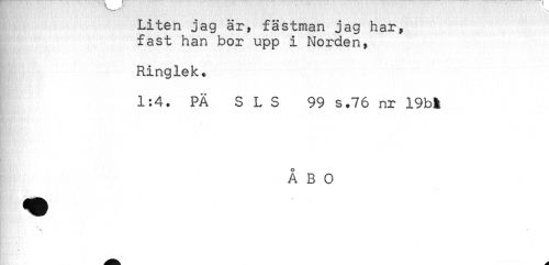 //// Liten jag är, fästman jag har, //// fast han bor upp i Norden, //// Ringlek. //// 1:4. PÄ S L S 99 s.76 nr 19bä //// ÅBO ////