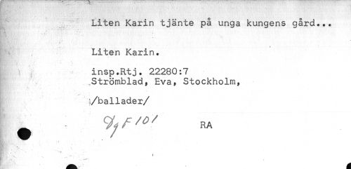 //// Liten Karin tjänte på unga kungens gård... //// . - - //// A ' " ; //// ['K* ' //// i* < . //// Liten Karin. //// insp.Rtj. 22280:7 //// .Strömblad, Eva, Stockholm, //// :/ballader //// /^ RA //// Bi ' ^^^ //// ^ , - - //// r - ......,' - //// — ^ ////
