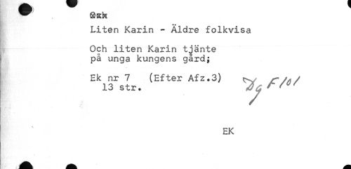 //// Liten Karin - Äldre folkvisa //// K //// Och liten Karin tjänte //// på unga kungens gård; //// Ek nr 7 (Efter Afz.3) ^ //// 13 str. //// *< //// EK //// * ////
