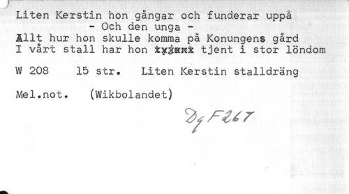 //// Liten Kerstin hon gangar och funderar uppå //// - Och den unga - //// Allt hur hon skulle komma på Konungens gård //// I vårt stall har hon iy^&Ki tjent i stor löndom //// W 208 15 str. Liten Kerstin stalldräng //// Mel.not. (Wikbolandet) //// < ////