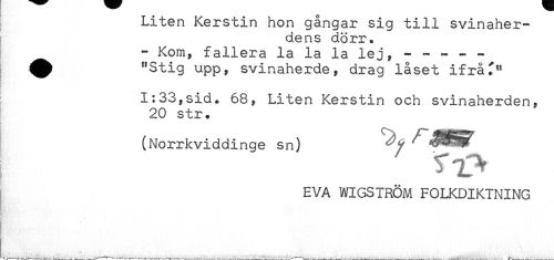 //// Liten Kerstin hon gångar sig till svinaher- //// dens dörr. //// - Kom, fallera la la la lej, - --- - //// ^ "Stig upp, svinaherde, drag låset ifrå^" //// 1:33,sid. 68, Liten Kerstin och svinaherden, //// 20 str. //// (Norrkviddinge sn) ^ ^ ^^ //// EVA WIGSTRÖM FOLKDIKTNING ////
