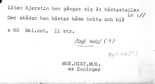 //// Liten Kjerstin hon gångar sig åt hästastallen //// * / //// /Der skådar hon hästar både hvita och blå //// s 80 Mel.not. 11 str. //// /DgF 460 //// /MUS.HISI.MUS. //// ms Enninger ////