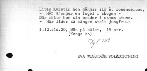 //// ^ - //// - - — . - r . //// Liten Kerstin hon gångar sig åt rosendelund, //// - Här sjunger en fogel i skogen - //// Där mötte hon sin broder i samma stund. //// - Här lider så mången stolt jungfru.- //// 1:13,sid.30, Mön på bålet, 18 str. //// (Konga sn) //// ^ EVA WIGSTRÖM FOLKDIKTNING ////