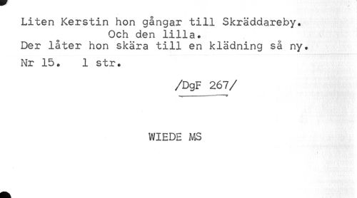 //// Liten Kerstin hon gångar till Skräddareby. //// Och den lilla. //// Der låter hon skära till en klädning så ny. //// Nr 15. 1 str. //// /DgF 267 //// /WIEDE MS ////