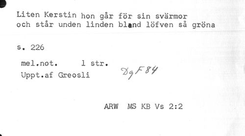 //// Liten Kerstin hon går för sin svärmor //// och står unden linden bland löfven så gröna //// s. 226 //// mel.not. 1 str. //// Uppt.af Greosli //// ARW MS KB Vs 2:2 ////