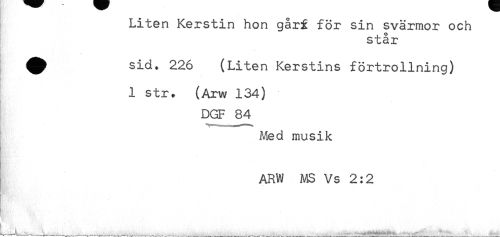 //// Liten Kerstin hon gåri för sin svärmor och //// står //// ^ sid. 226 (Liten Kerstins förtrollning) //// 1 str. (Arw 134) //// t //// DGF 84 //// Med musik //// ARW MS Vs 2:2 //// Kn , - //// ____. _____^___ ^ ^ ^ _ _ _ ^ - ' : ' ////