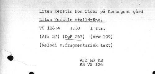 //// < //// ! //// < //// Liten Kerstin hon rider på Konungens gård //// Liten Kerstin stalldräng. //// VS 126:4 s.30 1 str. //// (Afz 27) (DgF 267) (Arw 109) //// (Melodi m.fragmentarisk text) //// ^ AFZ MS KB //// ! ^ AB VS 126 ////