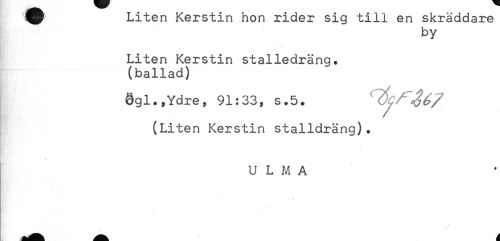 //// ^ Liten Kerstin hon rider sig till en skräddare //// by //// Liten Kerstin stalledräng. //// (ballad) //// Ögl.,Ydre, 91:33, s.5. //// (Liten Kerstin stalldräng). //// U L M A ////