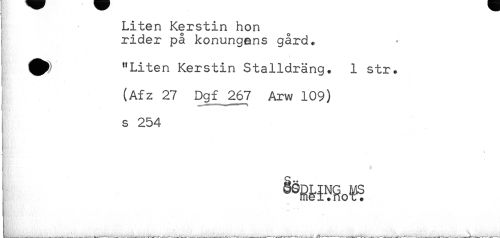 //// Liten Kerstin hon //// rider på konungans gård. //// "Liten Kerstin Stalldräng. 1 str. //// , (Afz 27 Dgf _267 Arw 109) //// s 254 //// i)' '. **" ////