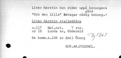 //// Liten Kerstin hon rider uppa konungens //// ^ ' gård //// "Och den lilla" Behagar nådig konung.- //// Liten Kerstin stalledräng //// * //// . //// , . , - . - . ' ' : . - : - //// s.117 Mel.not. 7 str. //// nr 15 Lunda sn, Södermld //// Se komm.s.108 av Emil Öberg //// # M.AK.FOLKMEL. ////