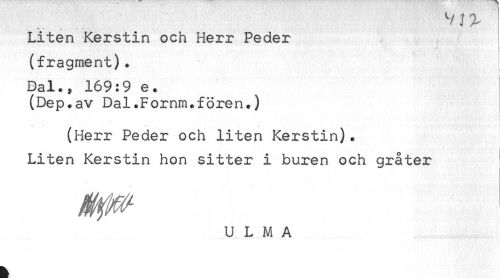 //// Liten Kerstin och Herr Peder //// (fragment)+ //// Dal., 169:9 e. //// (Dep.av Dal.Fornm.fören.) //// ... - //// (Herr Peder och liten Kerstin). //// Liten Kerstin hon sitter i buren och gråter ! //// U L M A ////