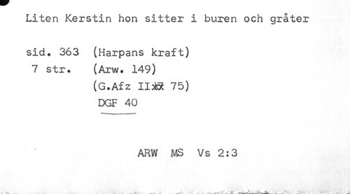 //// Liten Kerstin hon sitter i buren och gråter //// sid. 363 (Harpans kraft) //// 7 str. (Arw. 149) //// (G.Afz 11^ 75) //// DGF 40 //// ARW MS Vs 2:3 ////