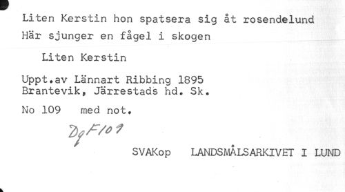 //// Liten Kerstin hon spatsera sig åt rosendelund //// Här sjunger en fågel i skogen //// Liten Kerstin //// Uppt.av Lännart Ribbing 1895 //// Brantevik, Järrestads hd* Sk. //// No 109 med not. //// SVAKop LANDSMÅLSARKIVET I LUND ////