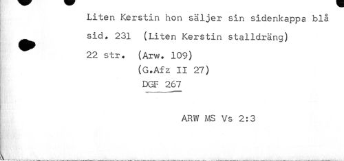 //// Liten Kerstin hon säljer sin sidenkappa blå //// ^ sid. 231 (Liten Kerstin stalldräng) //// 22 str. (Arw. 109) //// (G.Afz II 27) //// DGF 267 //// ARW MS Vs 2:3 ////