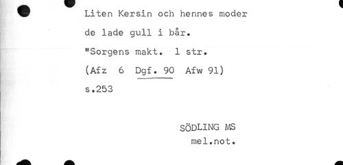 //// Liten Kersin och hennes moder //// de lade gull i bår. //// "Sorgens makt. 1 str. //// (Afz 6 Dgf. 90 Afw 91) //// s.253 //// SÖDLING MS //// mel.not. ////