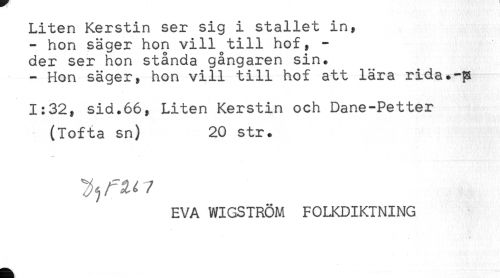 //// Liten Kerstin ser sig i stallet in, //// - hon säger hon vill till hof, - //// der ser hon stånda gångaren sin. //// - Hon säger, hon vill till hof att lära rida.-p //// 1:32, sid.66, Liten Kerstin och Dane-Petter //// (Tofta sn) 20 str. //// EVA WIGSTRÖM FOLKDIKTNING ////