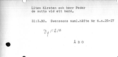 //// yr - "- ,' - ' ' //// Liten Kirsten och herr Peder //// de sutto vid ett bord, //// . //// 31:3.BO. Svenssons santl.häfte Nr 6.s.25-27 //// - //// ^ ÅBO ////
