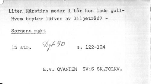 //// Liten Kärstins moder i bår hon lade gull- //// Hvem bryter löfven av liljeträd? - //// Sorgens makt //// 15 str. ^ s. 122-124 ^ //// i //// , . ' ' //// E.v. QVANIEN SV:S SK.FOLKV. //// ! ////