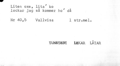 //// Liten oxe, lita' ko //// lockar jag så kommer ho" då //// Nr 40,5 Vallvisa 1 str.mel. //// lUNålEBI LEKAR LÅTAR ////