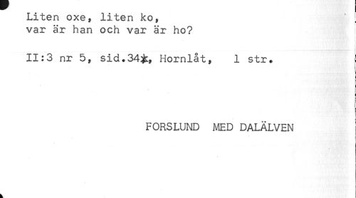 //// Liten oxe, liten ko, [ //// var är han och var är ho? i //// 11:3 nr 5, sid.34#, Hornlåt, 1 str. ! //// FORSLUND MED DALÄLVEN //// ! ////
