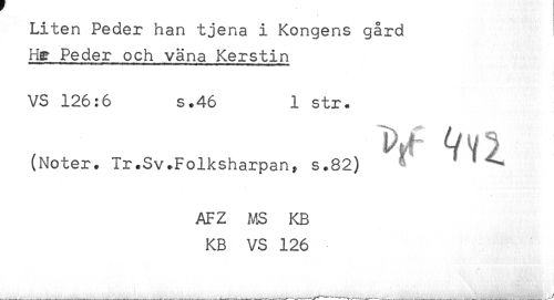 //// Liten Peder han tjena i Kongens gård //// He Peder och väna Kerstin //// VS 126:6 s.46 1 str. //// (Noter. Tr.Sv.Folksharpan, s.82) ' ^ //// AFZ MS KB //// KB VS 126 ////