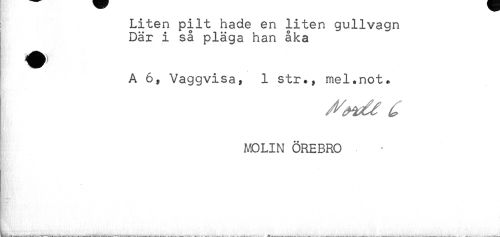 //// Liten pilt hade en liten gullvagn //// Där i så pläga han åka //// A 6, Vaggvisa, 1 str., mel.not. //// MOLIN ÖREBRO ////